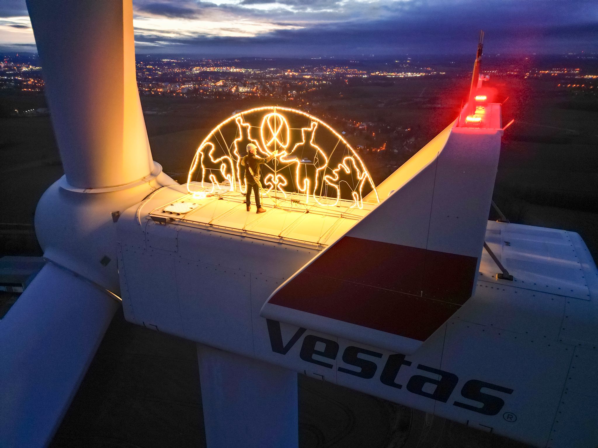 Colocan típica decoración navideña sobre un aerogenerador